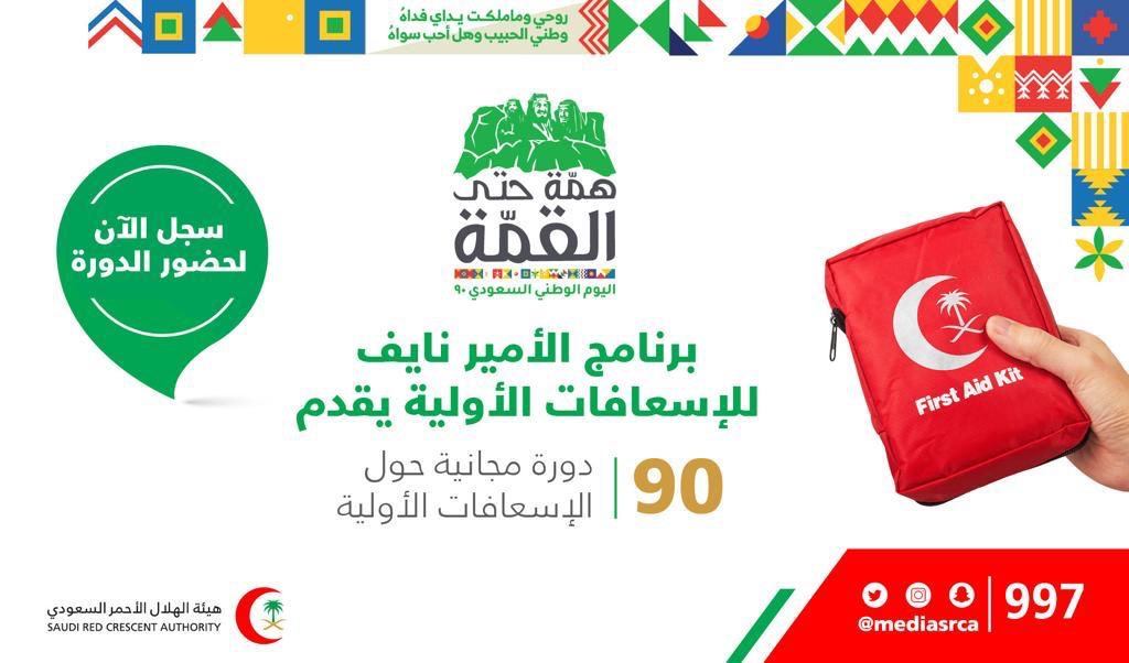 أعلنت هيئة الهلال الأحمر السعودي تقديم 90 دورة مجانية بمناسبة اليوم الوطني، لجميع أفراد المجتمع ضمن برنامج (الأمير نايف للأسعافات الأولية) في كل مناطق المملكة، وذلك وفقاً للتفاصيل الموضحة أدناه.