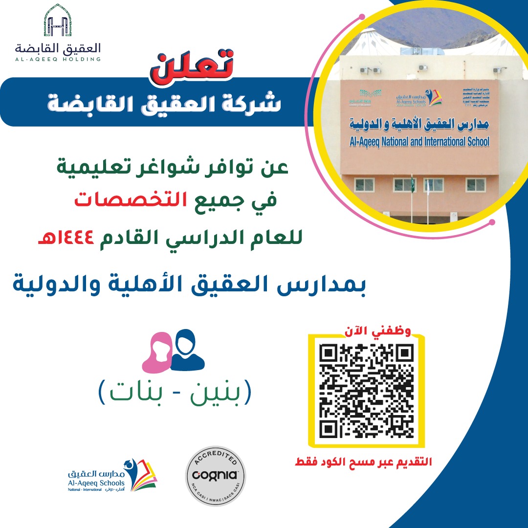 وظائف للجنسين اعلنت عنها اليوم مدارس العقيق الأهلية والدولية بالمدينة المنورة ولمزيدا من التفاصيل عن هذه الوظائف بالاسفل :-