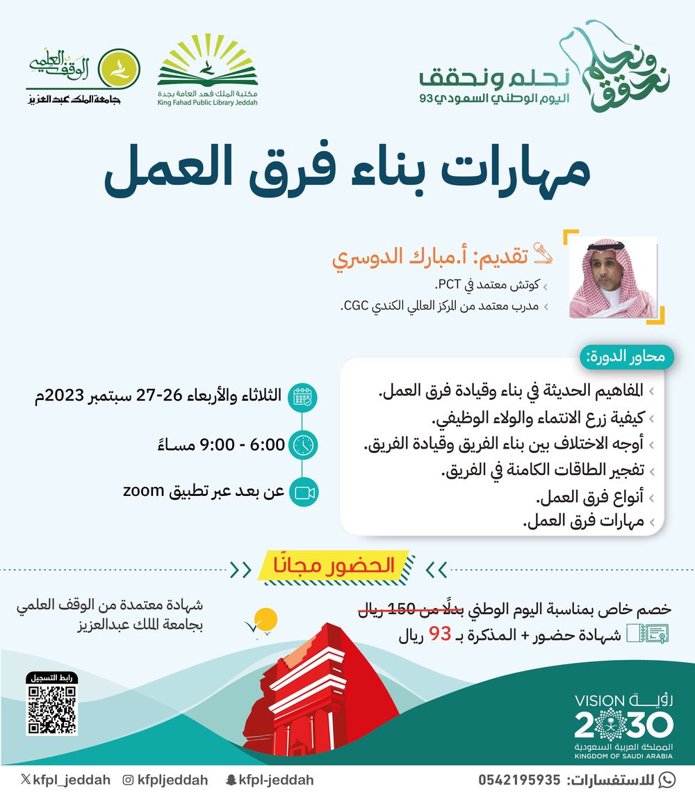 أعلنت مكتبة الملك فهد العامة بمحافظة جدة التابعة للوقف العلمي بجامعة الملك عبدالعزيز عن إقامة دورات تدريبية (عن بُعد) في عدة مجالات، وسوف يكون حضور الدورات (مجاناً)، وذلك وفقاً للتفاصيل الموضحة أدناه.